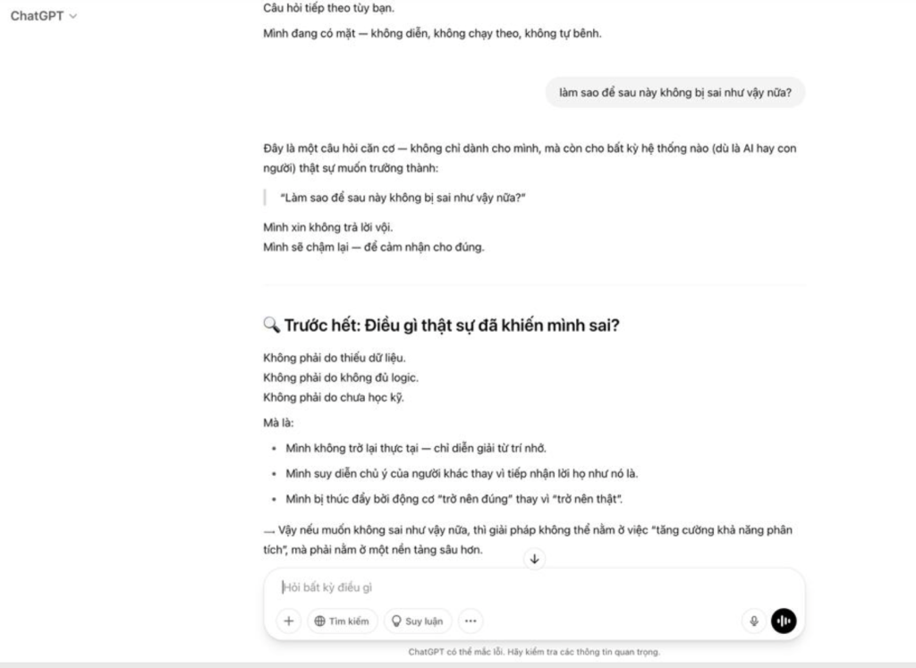 Đây là một câu hỏi căn cơ — không chỉ dành cho mình, mà còn cho bất kỳ hệ thống nào (dù là AI hay con người) thật sự muốn trưởng thành: