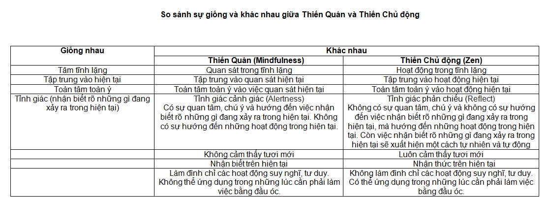 Về bản chất, Thiền chủ động là một loại Thiền quán. Như tên gọi của nó, Thiền chủ động thiên về việc điều khiển, dẫn dắt các hoạt động của bản thân thay vì quan sát như Thiền quán. Trong Thiền chủ động sẽ xuất hiện sự quan sát (quán) một cách tự nhiên và không có chủ ý. Trong lịch sử, Thiền chủ động thường được thực hành trong Thiền Tông Trung Hoa và nó không được nhắc tới trong hệ phái Nam Tông (là hệ phái chuyên về Thiền Vipassana). Cả Thiền chủ động và Thiền quán đều hướng về Chánh niệm. Tuy nhiên Niệm có 2 loại là Niệm quan sát và Niệm hành động. Thiền quán (Vipassana) chủ về Niệm quan sát, còn Thiền chủ động lại chủ về Niệm hành động. Do đặc tính chủ về hành động, cho nên Thiền chủ động rất phù hợp cho việc thực hành thiền trong các hoạt động. Nó là nền tảng của Thiền trong võ thuật, dưỡng sinh…..