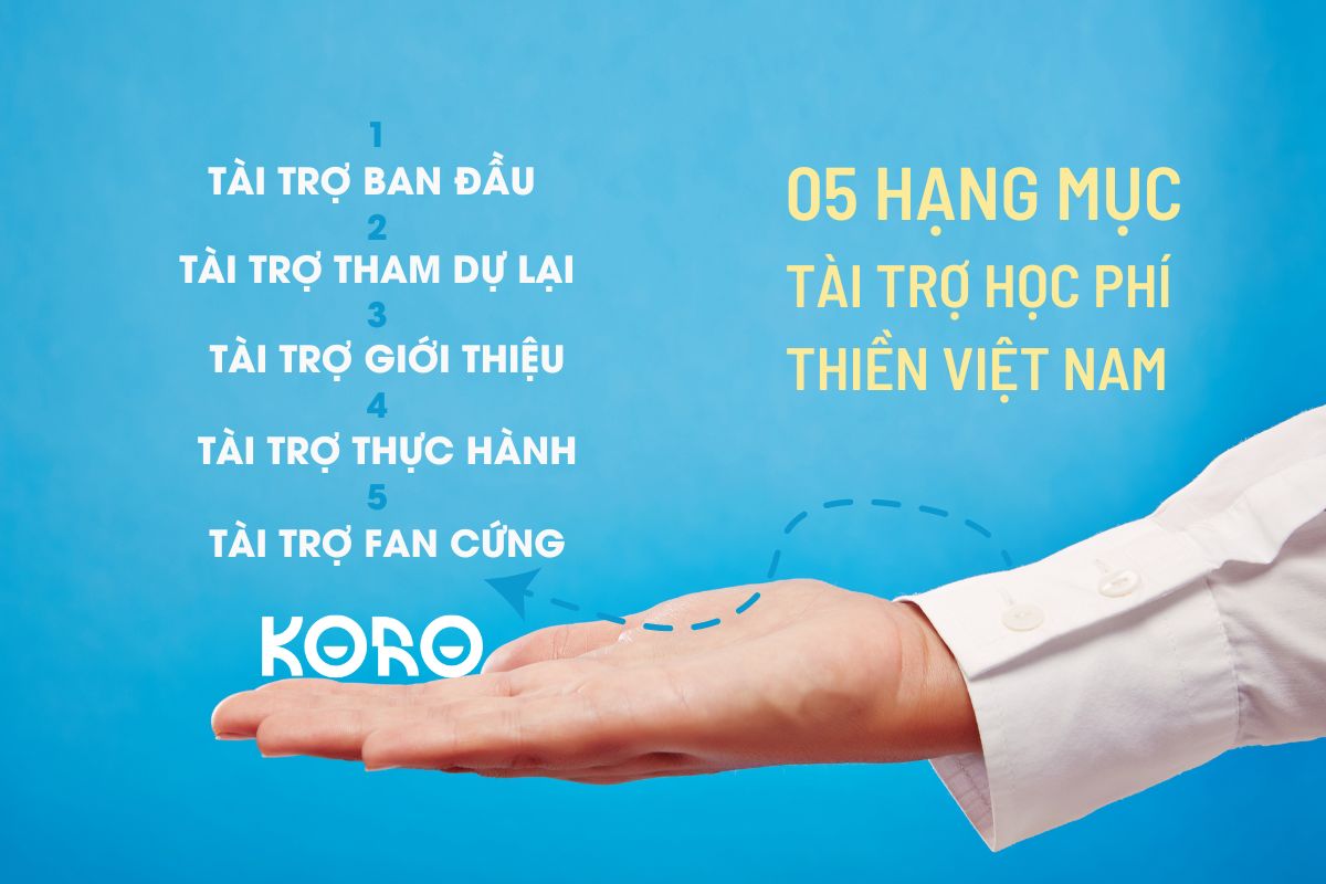 Tất cả các học viên khi tham dự lần đầu bất cứ khoá đào tạo về thiền nào, thuộc chương trình Thiền Việt Nam (được thể hiện trong phụ lục 01), nếu có đăng ký nhận tài trợ từ Koro, thì đều sẽ được Koro tài trợ toàn bộ học phí dưới hình thức tặng Voucher khoá thiền 100% học phí.