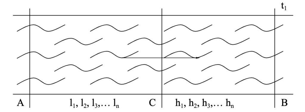 Bây giờ ta hãy quan sát hai dòng nước này ở thời điểm t. Giả sử lúc này dòng nước AC là một khối nước gồm các phân tử nước l1, l2, l3,… ln. Còn trên dòng nước CB là một khối nước gồm các phần tử nước h1, h2, h3,… hn.