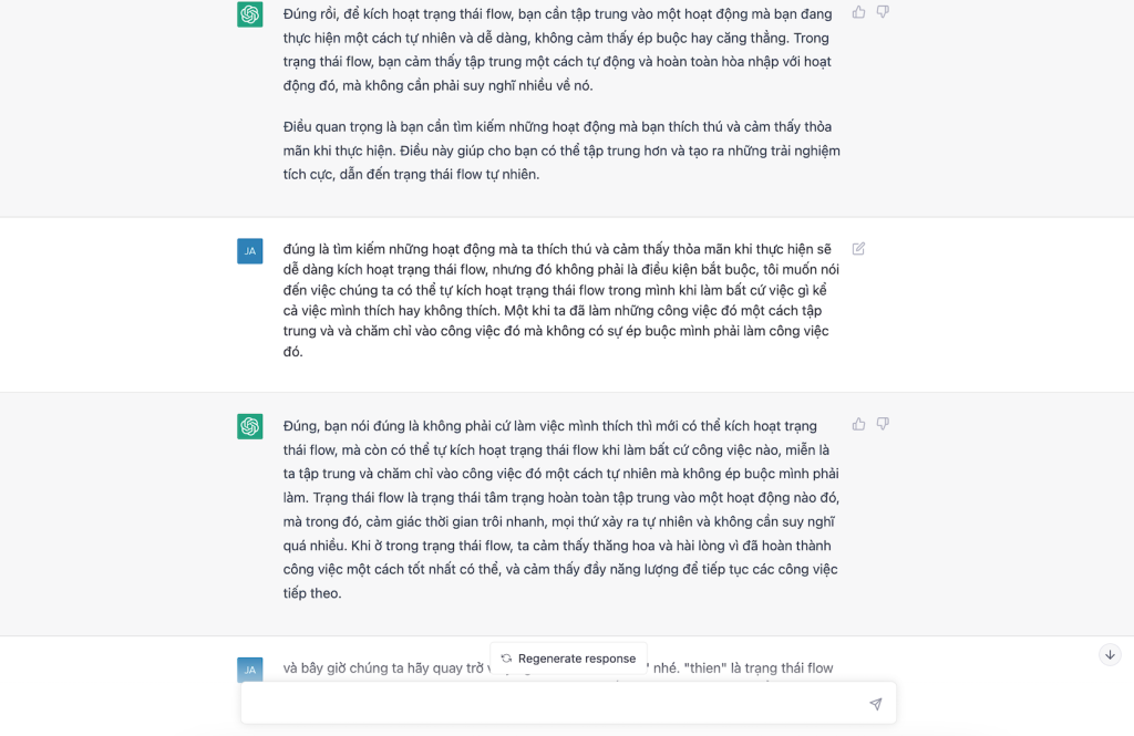 Chat GPT: Vâng, tôi hiểu ý bạn muốn truyền đạt. Trạng thái flow được kích hoạt khi bạn tập trung hoàn toàn vào một hoạt động và cảm thấy hoàn toàn hài lòng và thỏa mãn khi thực hiện hoạt động đó. Trạng thái flow không phụ thuộc vào điều kiện bên ngoài, mà là do bản thân chúng ta tạo ra bằng cách tập trung và chăm chỉ vào một hoạt động nào đó.