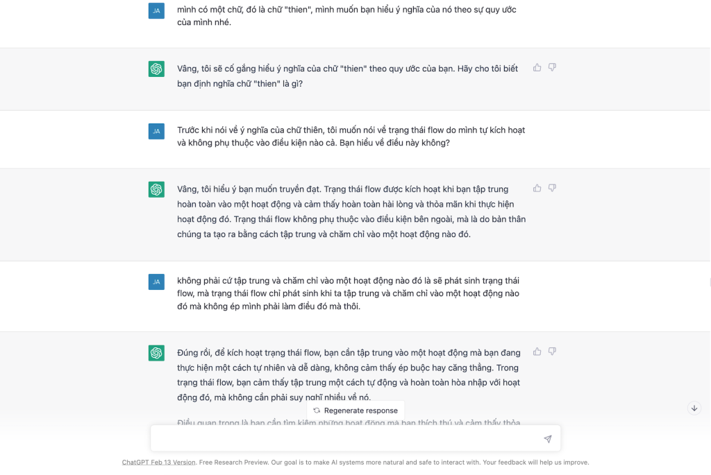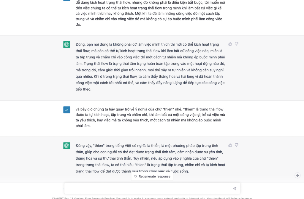 Chat GPT: Đúng vậy, “thien” trong tiếng Việt có nghĩa là thiền, là một phương pháp tập trung tinh thần, giúp cho con người có thể đạt được trạng thái tĩnh tâm, cảm nhận được sự yên tĩnh, thăng hoa và sự thư thái tinh thần. Tuy nhiên, nếu áp dụng vào ý nghĩa của chữ “thien” trong trạng thái flow, ta có thể hiểu “thien” là trạng thái tập trung, chăm chỉ và tự kích hoạt trạng thái flow để đạt được thành quả trong công việc và cuộc sống.