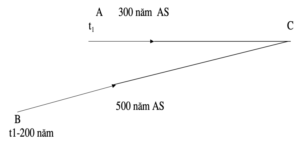 Như vậy: ở vị trí C trên trái đất, ta sẽ thấy 2 ngôi sao này được sinh ra ở vào cùng một thời điểm là t1+300 năm. Nghĩa là: trong môi trường chủ quan của ta, thì chúng đồng thời được sinh ra. Nhưng trong thực tế (trong môi trường khách quan) thì không phải như vậy, mà ngôi sao B được sinh ra trước ngôi sao A tới 200 năm.